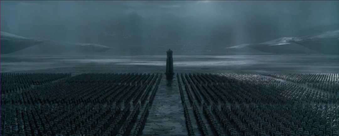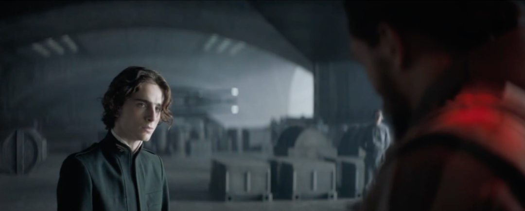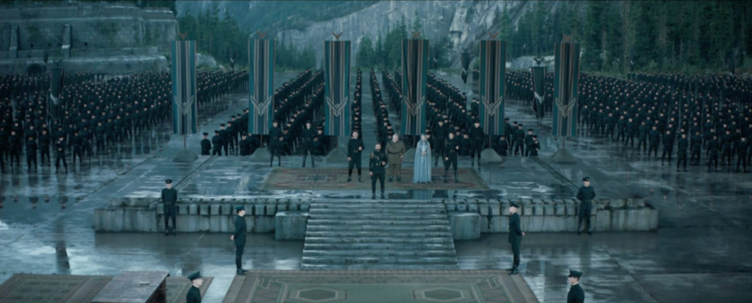 皇帝的使臣带着任命前来,厄催迪家族在此迎接并完成任命仪式,导演在影片中用了很多的比较级镜头来突出人类在庞然大物面前的渺小。青绿的冷色调,整齐迎接使臣的方队,以黑色的服装突显庄重和严肃的氛围。人的肤色往往处于中性的状态。