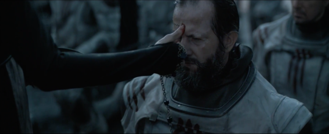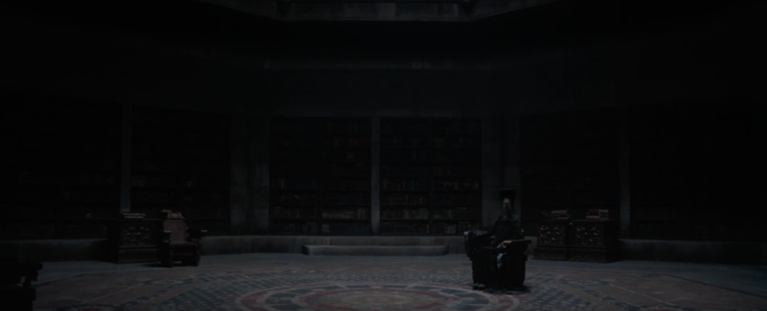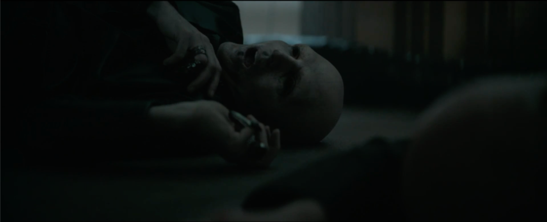 圣母测试保罗这场戏中,在后期处理中用了大量的遮罩来突显人物的轮廓光影,深邃的黑,形成了未知的压抑氛围,圣母头戴黑纱坐于光中,身体却尽显黑暗,与周围的暗部呼应,仿佛为生命背后的决裁者,画面极具张力。大面积的黑色把神秘和危险气息氛围烘托到了极点,对保罗形成了极大的压迫感,侧面表现出其姐妹会犹如一双巨大的黑暗之手在暗中操纵着一切。在这场戏中,保罗的情绪是不断变化的,从不明所以到痛苦再到无惧。