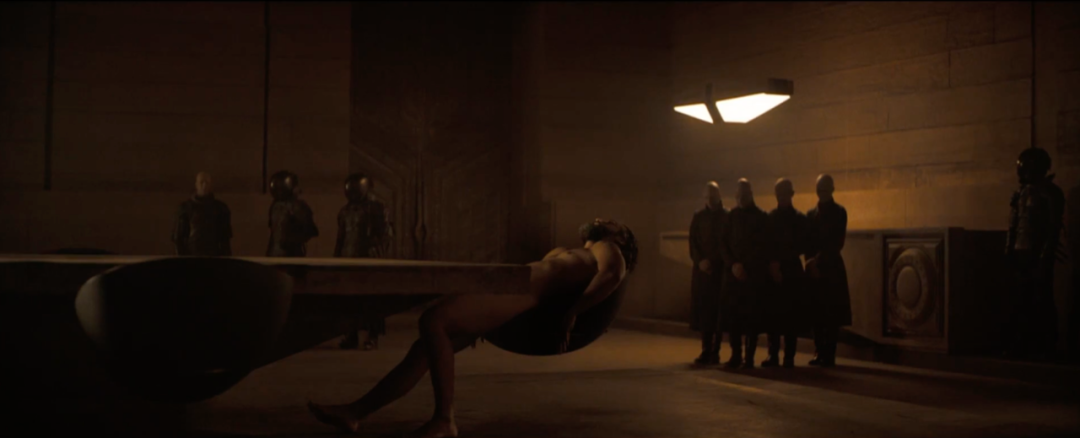 厄崔迪家族一夜之间被灭亡,这里像及了中世纪欧洲的一副油画,公爵呈裸体处于弱势一方,与穿着整齐军装的哈克南家族形成鲜明的对比,为后来公爵咬破毒药同归于尽造成了巨大的戏剧反差,公爵咬破毒药前是暖色,咬破毒药后是冷色,淡淡的绿色代表着中毒死亡。