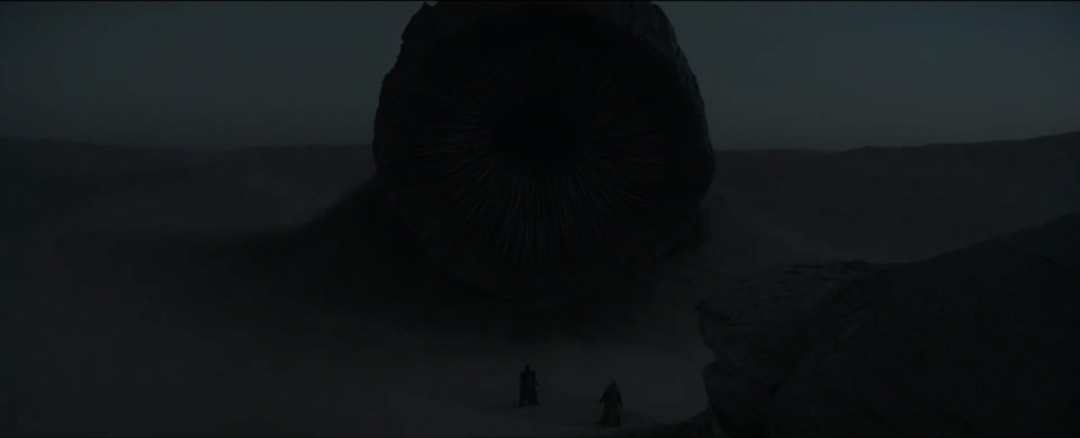 保罗一行人外出这场戏中,介绍了星球的地理环境背景及香料的采集等。贯穿全影片的导演风格“巨型美学”得以体现,影片的镜头总是很极端,沙漠中的大量广角镜头,表示人类在大自然中是一个非常渺小的存在,巨大的沙虫与渺小的人类造成了视觉上强烈的反差感。影片没有一昧地追求当下好莱坞大片标配的清橙对比色调,荒凉般的黄色色调,时而模糊的画面,漫天黄沙,中性低饱和的肤色,配色的完美统一,画面犹如恢弘的史诗令人震撼。