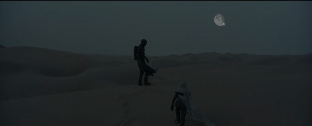 色彩作为烘托影片情绪和温度的重要手段,能让观众直观的感受了解到画面中的气氛和情绪。保罗母子夜幕穿越沙虫地带,微微的暮色带着薄薄的蓝绿色,夜晚的清冷与荒凉,与白天耀目的炙热感形成了极大的反差。